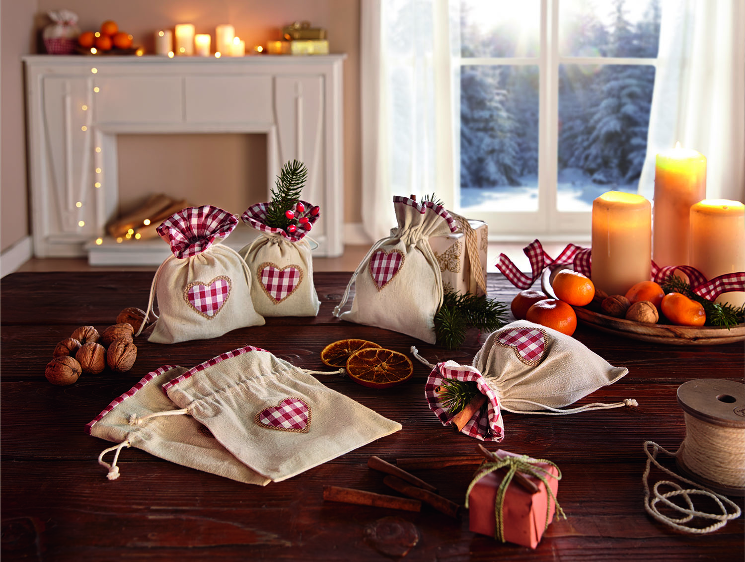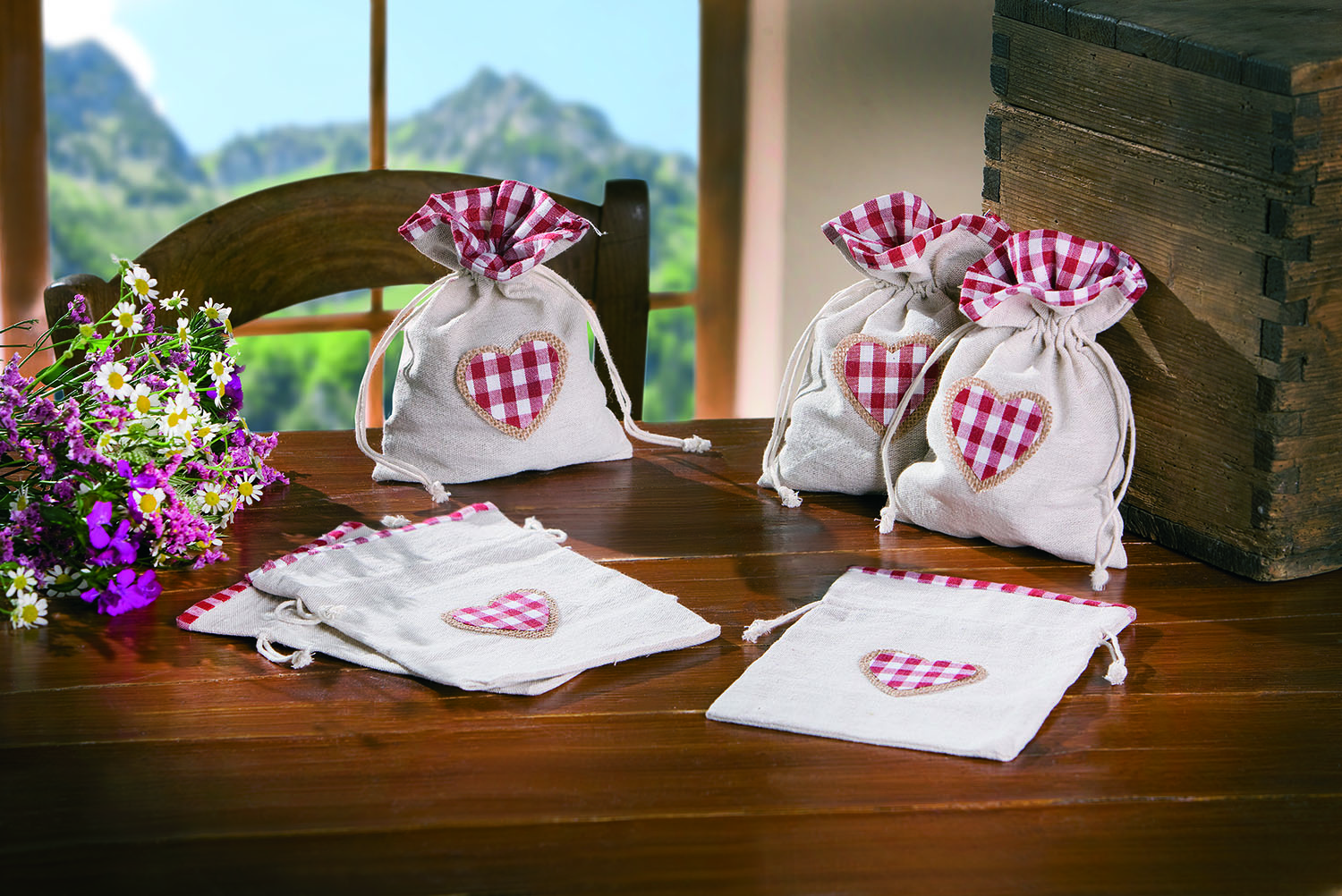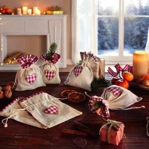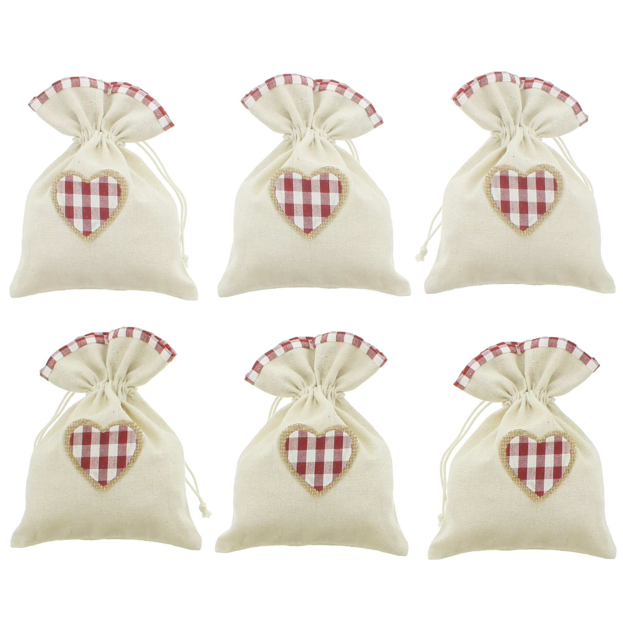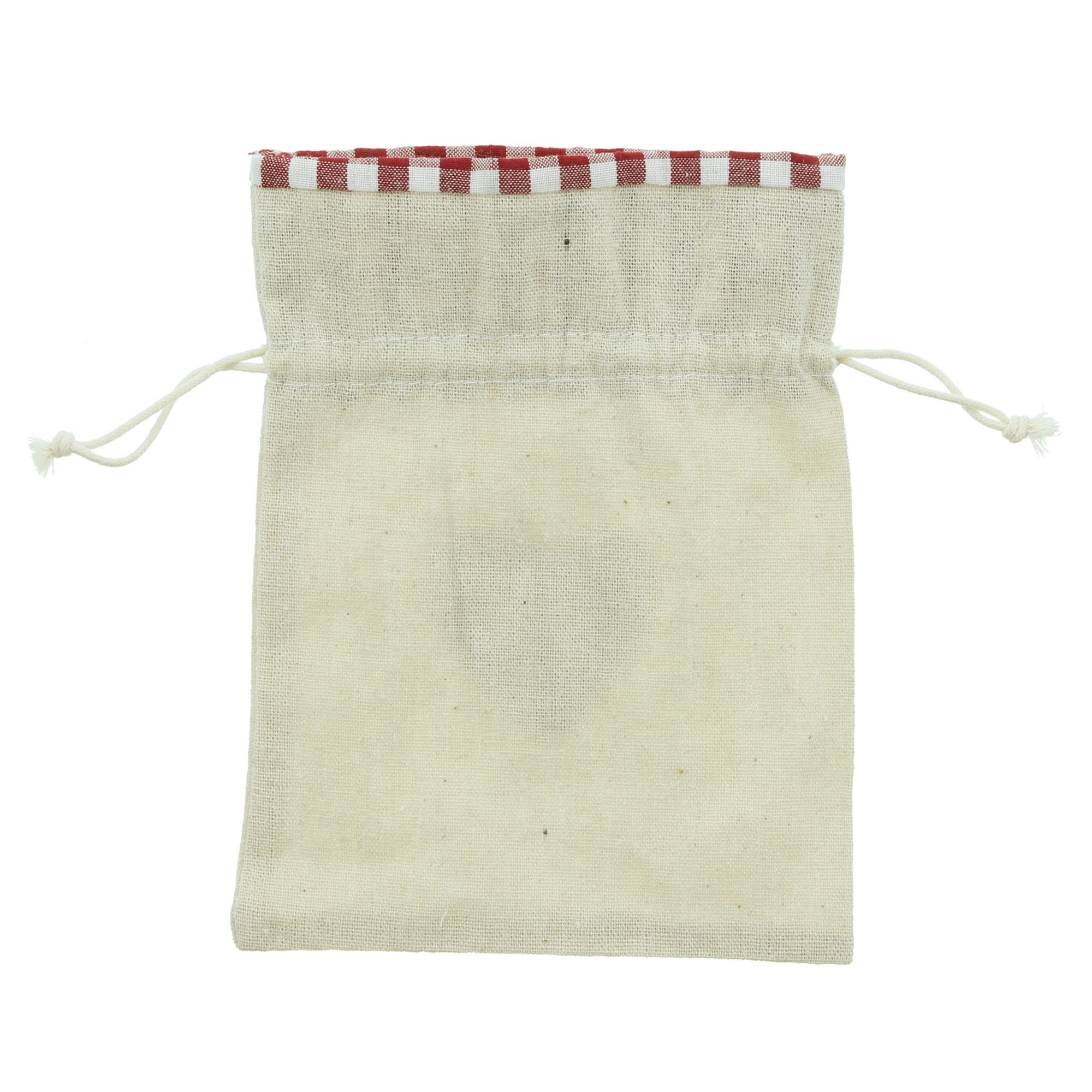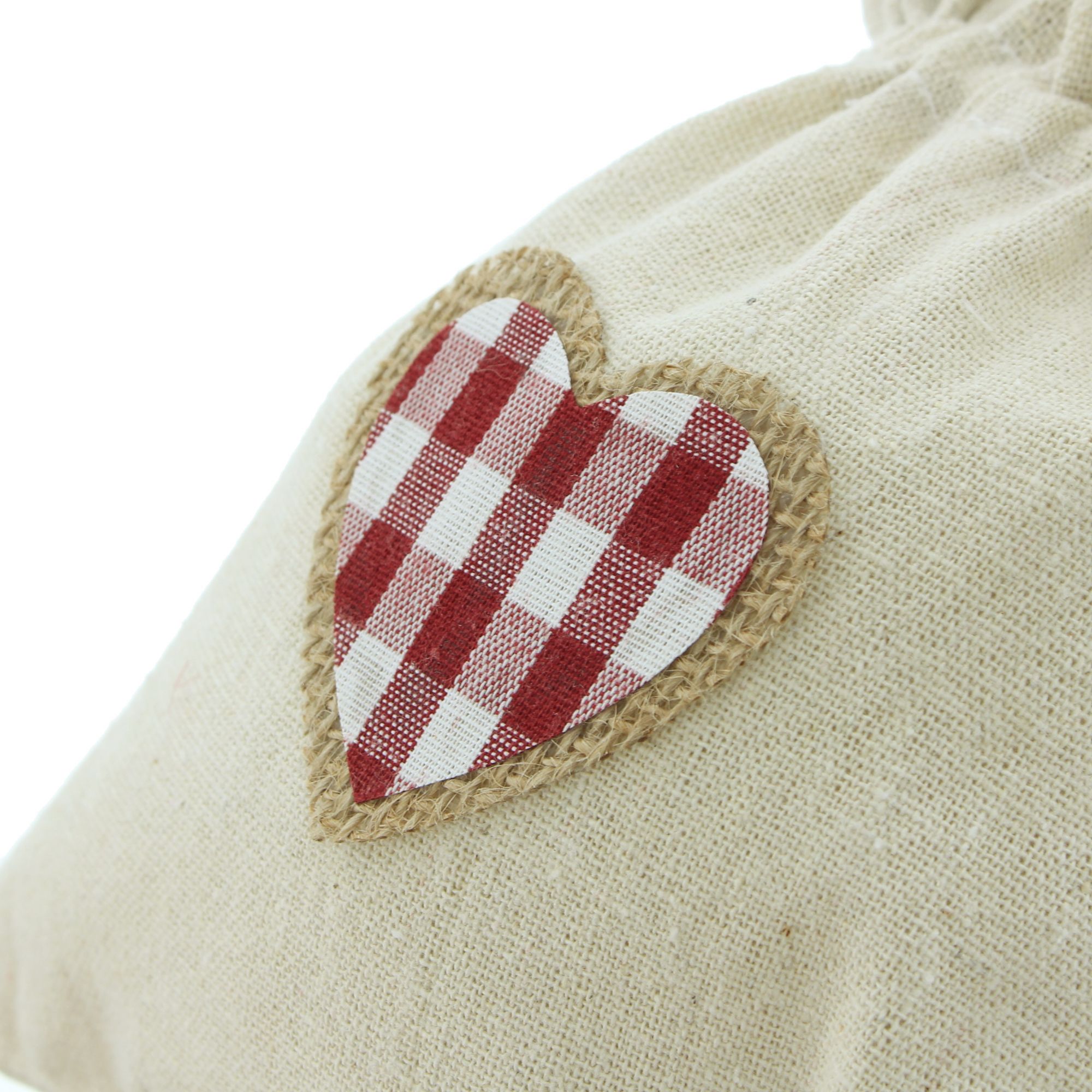 praktische Textilbeutel in charmantem Stil, Bordüre und Herzapplikation in schönem Karo, verschließbar durch eingearbeitetes Zugband, 80% Polyester, 15% Baumwolle, 5% Viscose