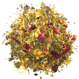 Himbeerblätter, Fenchel, Brombeerblätter, Erdbeerblätter, Sonnenblumenblüten, Anis, Ringelblumenblüten (7%), Hagebuttenschalen, Apfel, Aroma, Haselnussblätter, Melissenblätter, Spitzwegerichkraut (3%), Rosenblüten, Wollblumenblüten (2%), Holunderblüten, Holunderbeere, Pfefferminze