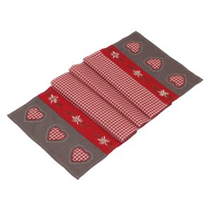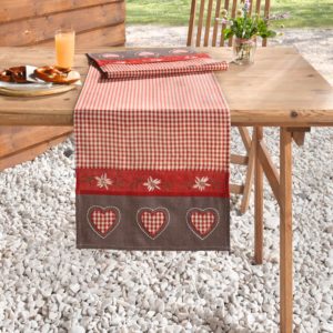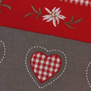 rot/beige karierter Grundstoff mit roter und brauner Borte, aufwändig bestickt mit Edelweißmotiv, 100% Polyester